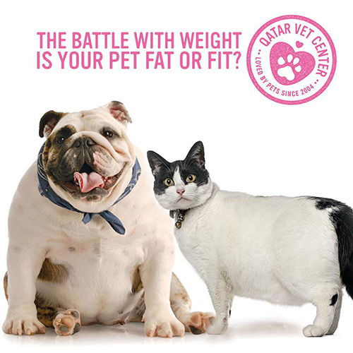 Just like many of their owners, pets all over the world are facing the battle of the bulge, that is, weight gain. At Qatar Veterinary Center we see overweight cats and dogs on a daily basis. Some are just mildly so, others are already obese. Although owners often associate giving extra food and treats to their pets with love, these extra pounds can unfortunately be really harmful to their health. The extra weight can be hard on their heart, joints, and metabolism. A study has even found that overweight dogs live an average of two full years LESS than their normal weighted siblings. There are two factors to weight gain and weight loss, that is diet and exercise. Regular exercise is very important to your pet’s mental and physical health. Pets who are out of shape need to start slowly, this can be short sessions of playing with toys for a cat, or short walks or swims for a dog. With the hot weather approaching here in Qatar we must use extreme caution with outdoor exercise. The most important factor is diet. Some pets just need to eat less, others may need a light food or a prescription diet, some may need blood testing to rule out a medical problem. If you are unsure if your pet’s weight is normal, or are having trouble controlling their weight, please make an appointment to see your QVC Veterinarian for an exam and to make a plan to help keep your pet healthy.